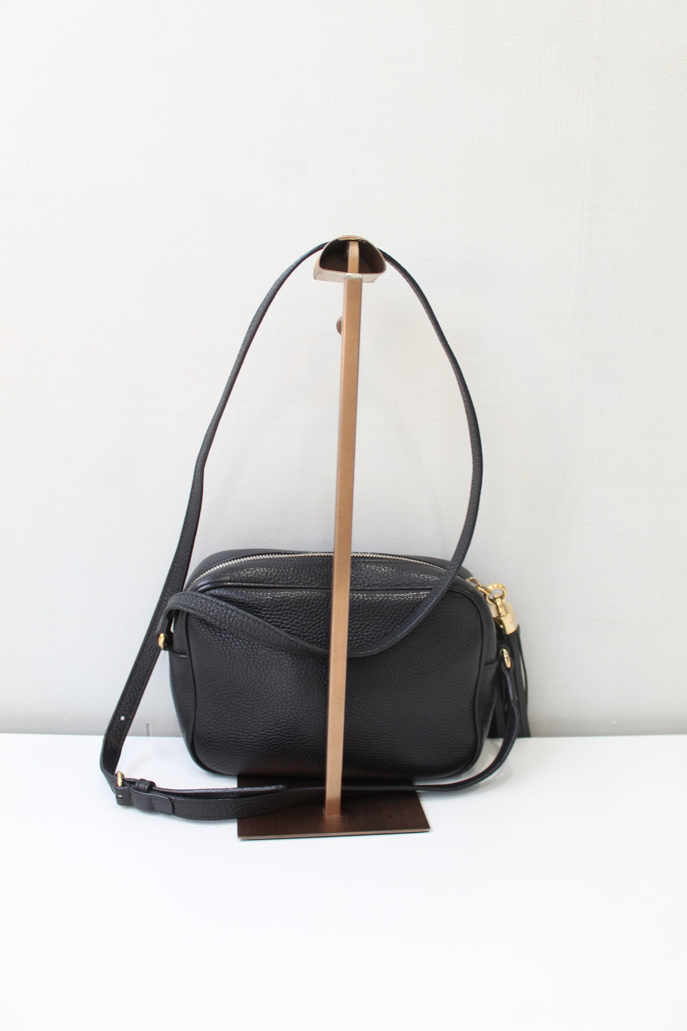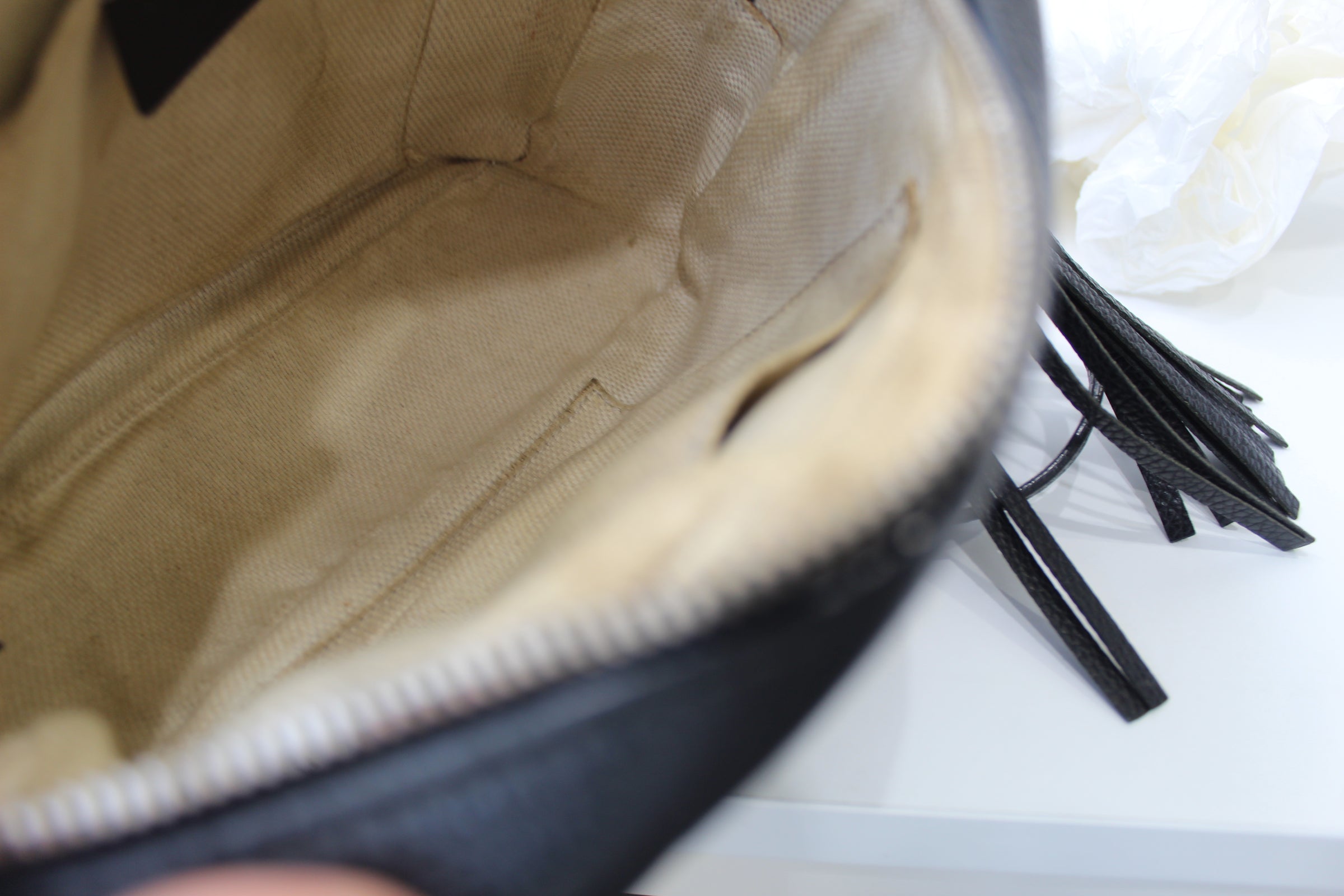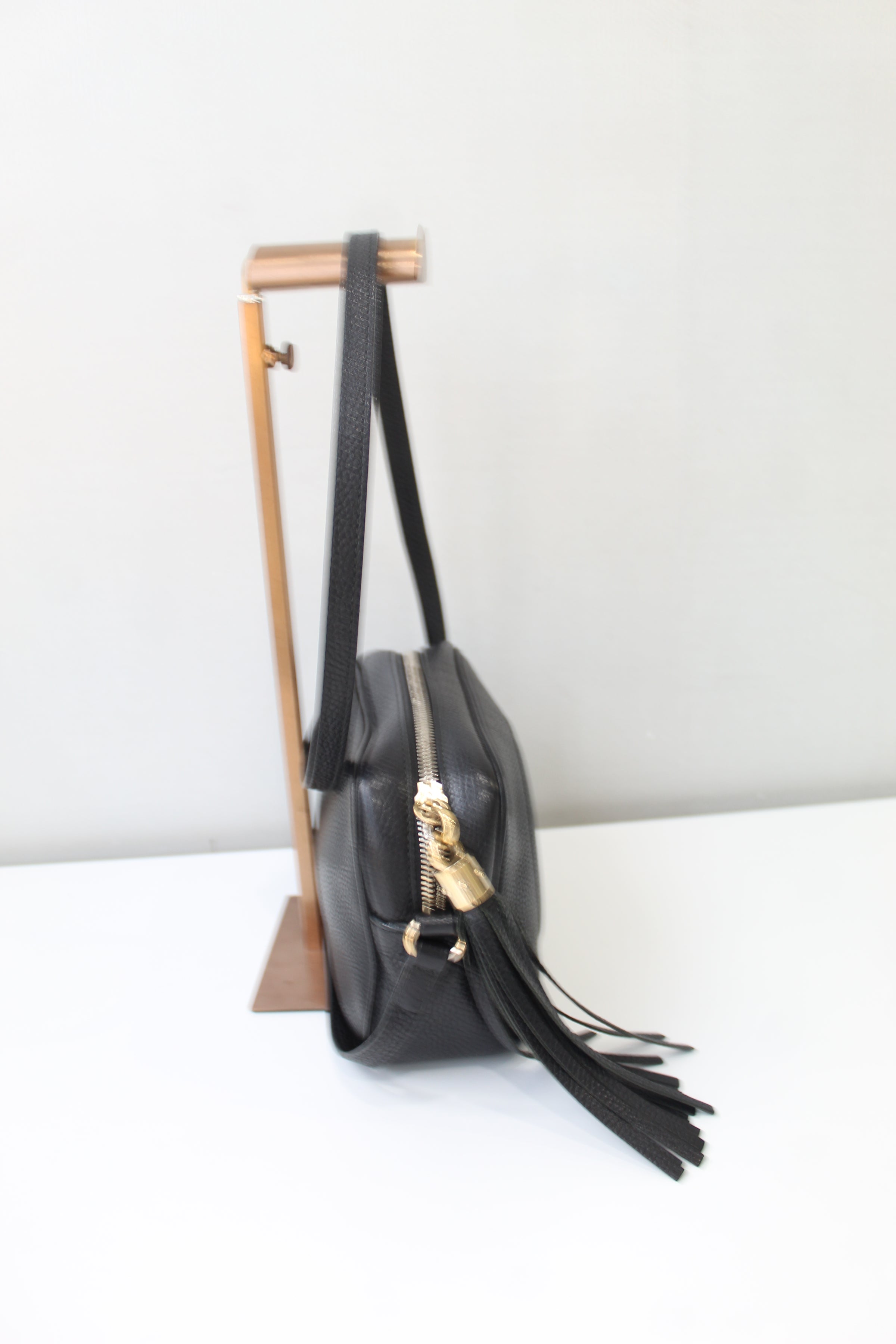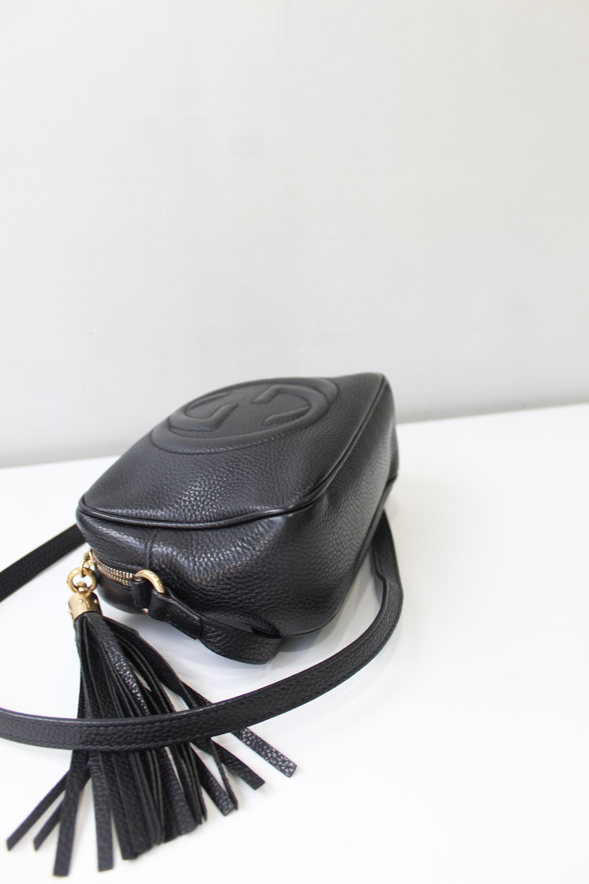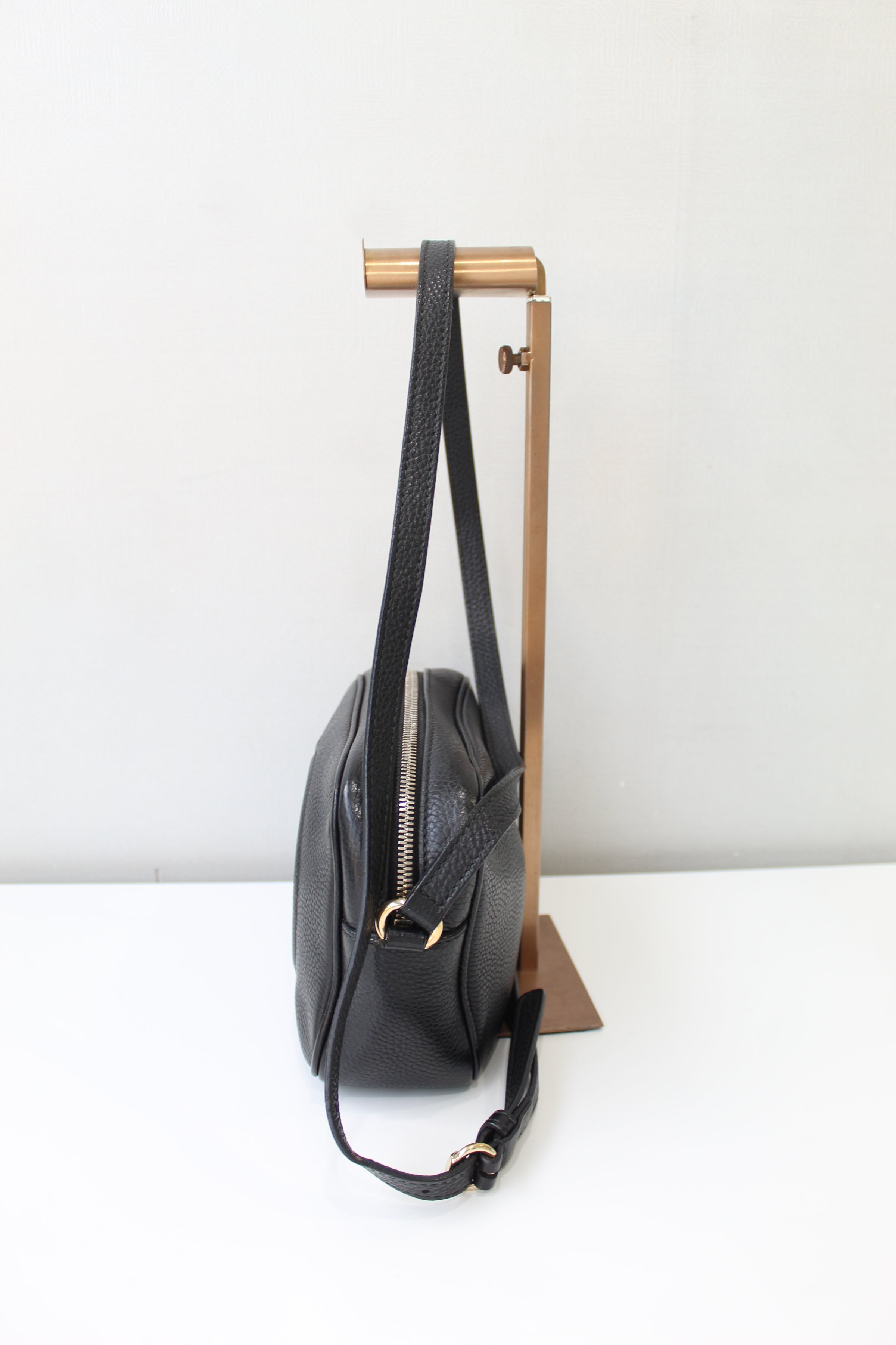 Gucci is a Italian luxury brand of fashion and leather goods. This too handle bag fits comfortably on the shoulder too. It features a zipper top and an interior zipper pocket.
